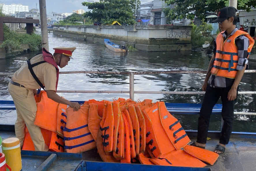 Trên các tuyến đường thủy, Phòng CSGT cũng đã bố trí sẵn sàng lực lượng ứng trực 24/24, chuẩn bị xuồng, phao cứu sinh,… kết hợp tuần tra xuyên suốt trên các tuyến, tập trung vào những điểm dễ xảy ra lốc xoáy, nước chảy xiết, luồng cong gấp, những công trình đang thi công sửa chữa, cầu yếu, những nơi có nguy cơ sạt lở cao,… để cảnh báo cho người dân. Đồng thời tăng cường kiểm tra, hướng dẫn các quy định, biện pháp an toàn và kinh nghiệm trong phòng tránh tai nạn, phòng chống lụt bão cho các chủ phương tiện.