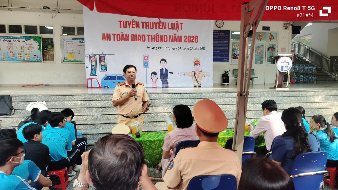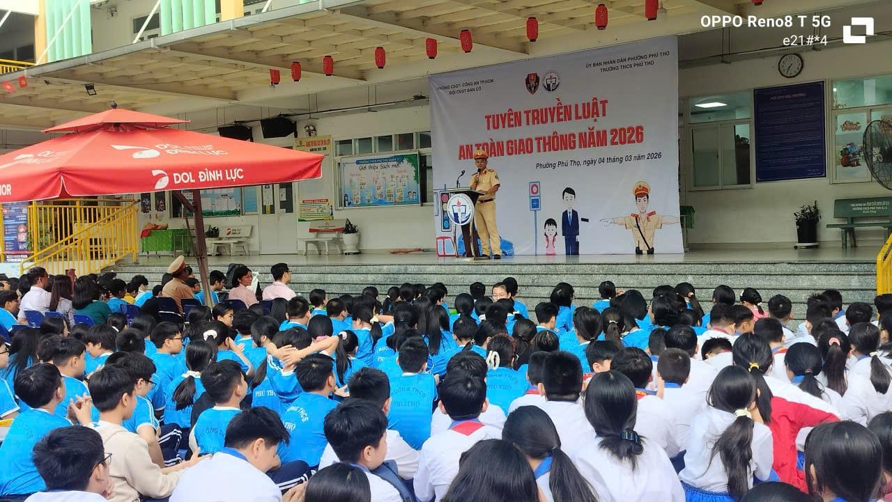 Theo đó, sáng ngày 04/3/2026, Đội CSGT Bàn Cờ phối hợp Trường trung học cơ sở Phú Thọ tuyên truyền Luật trật tự, an toàn giao thông cho 1200 học sinh nhà trường.