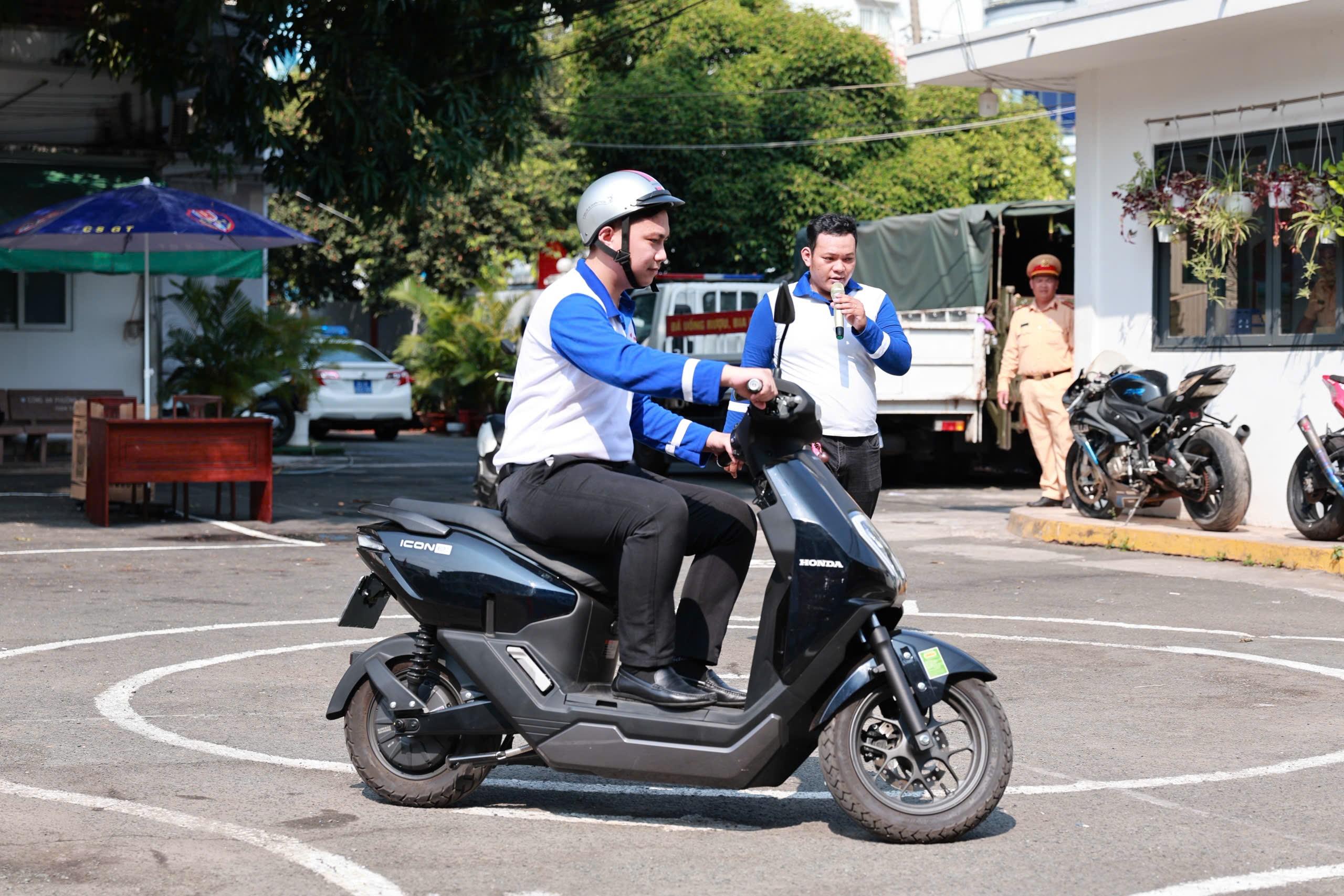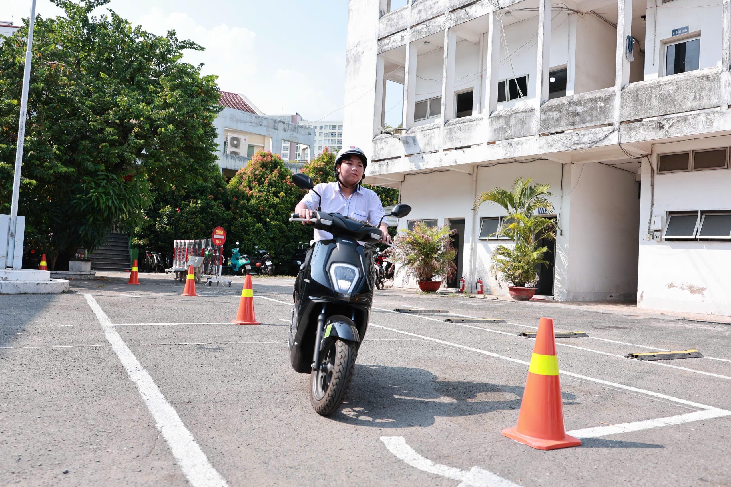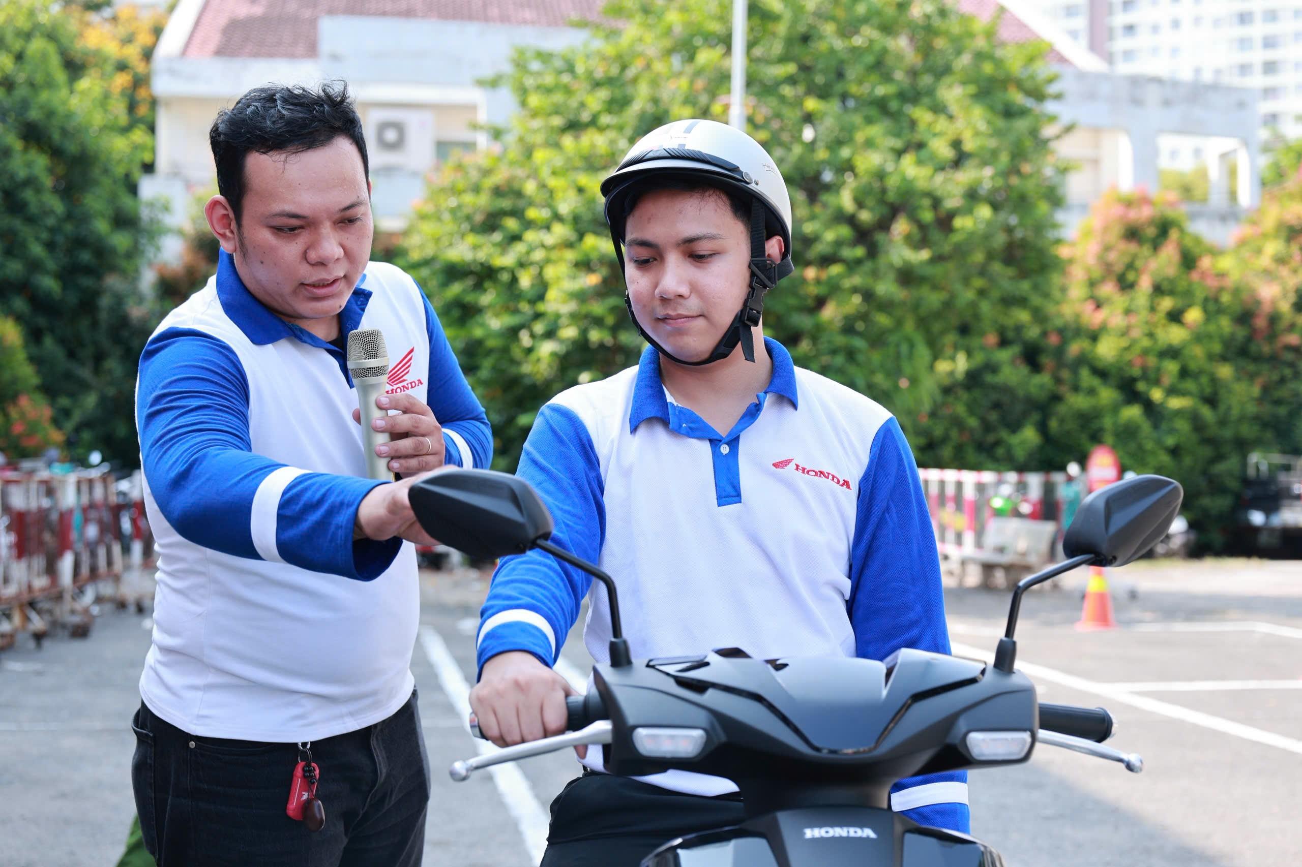 Hình ảnh Kỹ thuật viên lái xe an toàn của Công ty TNHH Mô tô Hoàng Việt hướng dẫn và thực hành cho các em học sinh của Trung tâm GDNN – GDTX Quận 11 trước phần thi thực hành