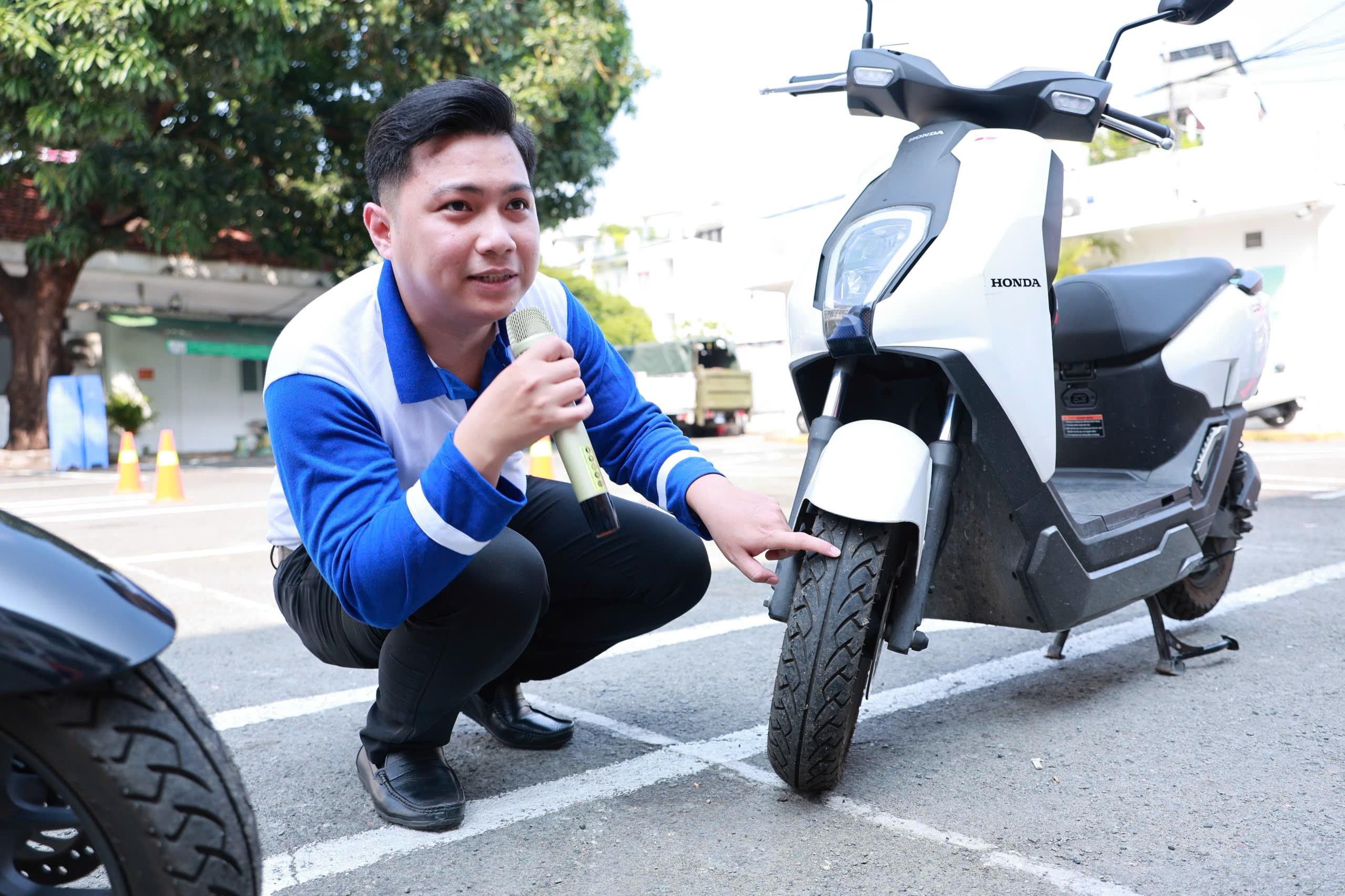 Trước phần kiểm tra thực hành, các Kỹ thuật viên lái xe an toàn Công ty TNHH Mô tô Hoàng Việt đã hướng dãn thật kỹ từng bước kiểm tra xe, thực hành kỹ năng lái xe an toàn cho học sinh.