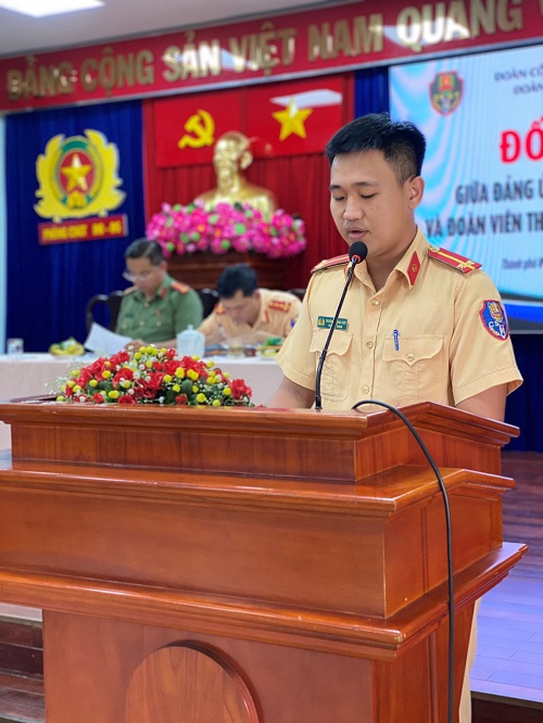 Chi đoàn Trạm CSGT Tân Túc phát biểu tham luận nội dung: “Thuận lợi, khó khăn trong công tác phối hợp đơn vị địa phương, đơn vị kết nghĩa trong thực hiện công tác Đoàn”