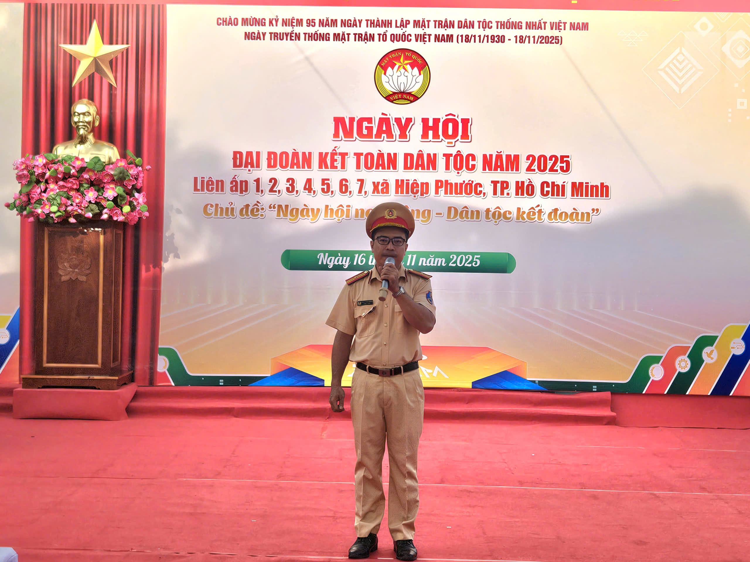 Sáng ngày 16/11/2025, Chi đoàn Trạm CSGT Đa Phước phối hợp với Đoàn Thanh niên xã, Công an xã Hiệp Phước tổ chức tuyên truyền pháp luật về trật tự, an toàn giao thông cho 200 người dân, hội viên, đoàn viên thanh niên nhân dịp Ngày hội Đại đoàn kết toàn dân tộc năm 2025.