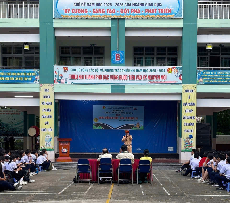 Sáng ngày 07/10/2025, vào lúc 07h00, Đội CSGT Phú Lâm – Phòng PC08 đã tổ chức buổi tuyên truyền pháp luật về Luật Trật tự, An toàn giao thông đường bộ tại Trường THCS Lê Anh Xuân (số 211/53 đường Vườn Lài, phường Phú Thọ Hoà, TP. Hồ Chí Minh).