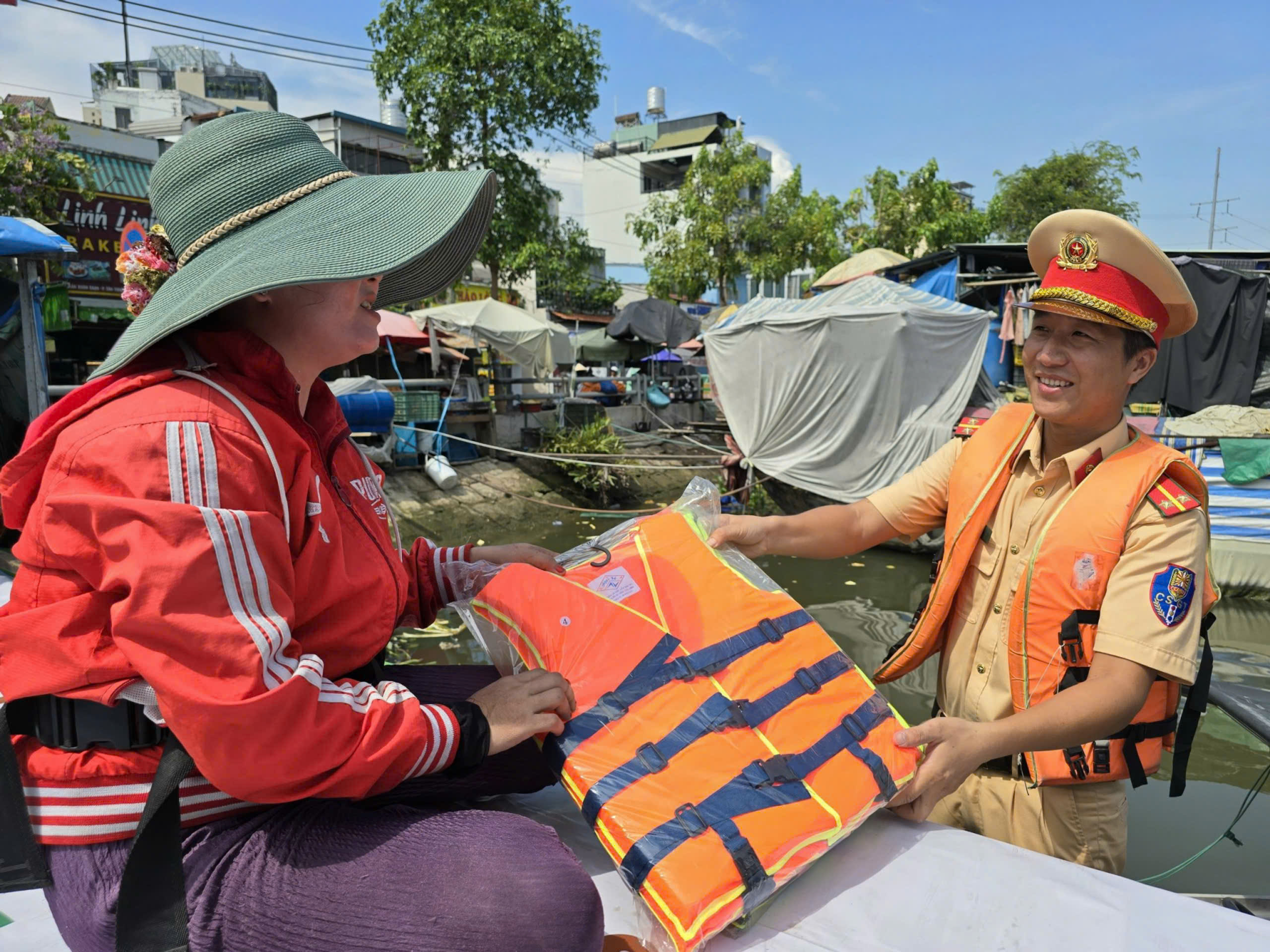 Hình ảnh: CBCS Trạm CSĐT Vàm Sát trao tặng áo phao cho 01 chủ hộ sinh sống trên phương tiện