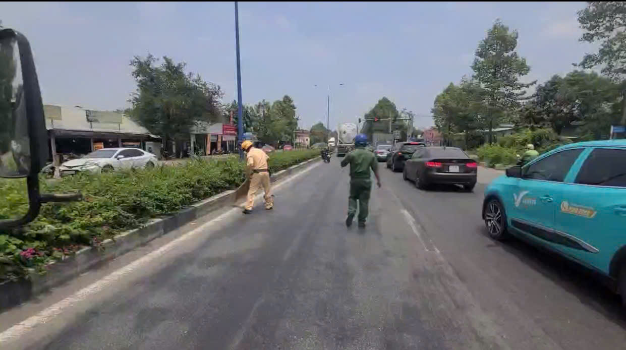 Ngay sau khi nhận được thông tin, tổ tuần tra kiểm soát của Đội CSGT Bình Triệu gồm Thiếu tá Nguyễn Hùng Thuân, Thiếu tá Trần Thanh Tân và Đại úy Nguyễn Minh Tuệ đã nhanh chóng có mặt tại hiện trường. Các đồng chí kịp thời triển khai các biện pháp đảm bảo an toàn giao thông như ra tín hiệu cảnh báo từ xa, điều tiết phương tiện di chuyển chậm, tránh khu vực nguy hiểm. Đồng thời, trực tiếp sử dụng chổi để quét dọn và kiên trì nhặt từng cây đinh, từng mảnh kim loại nhỏ còn sót lại trên mặt đường nhằm đảm bảo xử lý triệt để, không để sót gây nguy hiểm cho người tham gia giao thông.