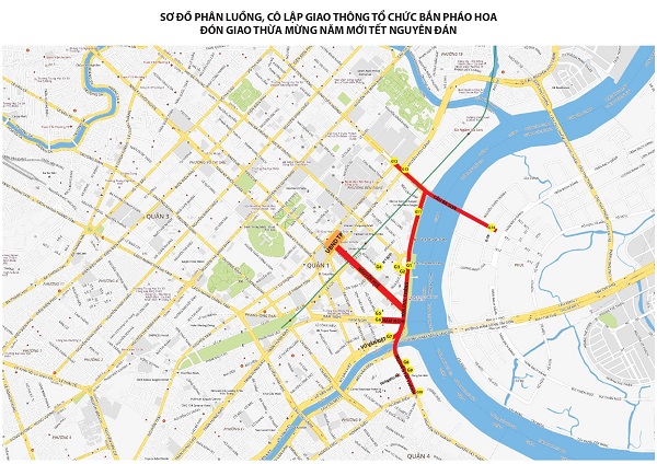 - Khu vực tổ chức cho nhân dân Thành phố xem chương trình pháo hoa nghệ thuật: Tuyến đường hoa Nguyễn Huệ, tuyến đường Tôn Đức Thắng đoạn từ vòng xoay Công trường Mê Linh đến Cầu Khánh Hội. Nhằm đảm bảo an ninh trật tự và trật tự an toàn giao thông tại khu vực trong thời khắc giao thừa. Ngoài ra, để đảm bảo an ninh và dự phòng các tình huống khẩn cấp, một số tuyến đường xung quanh sẽ được cô lập, không cho các phương tiện di chuyển vào như: khu vực Cầu Ba Son, Khu vực Cầu Khánh Hội, đoạn đường Võ Văn Kiệt Từ giáp Tôn Đức Thắng đến Hồ Tùng Mậu, đường Hàm Nghi từ giáp Tôn Đức Thắng đến Hồ Tùng Mậu.