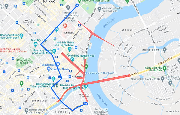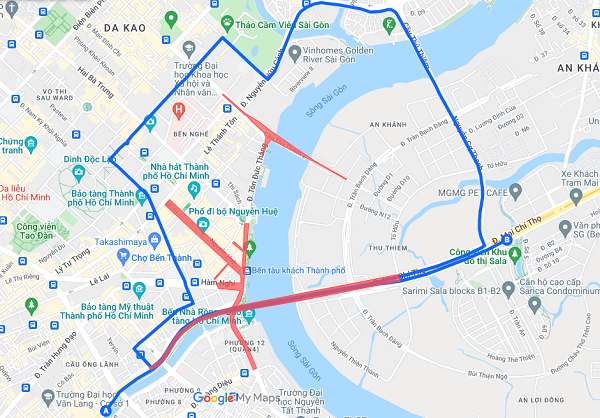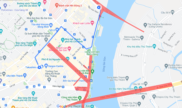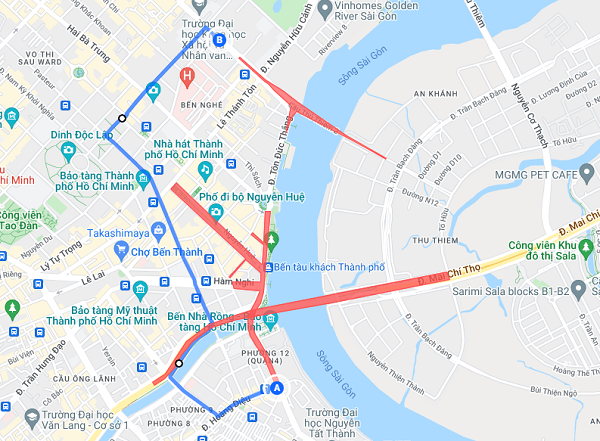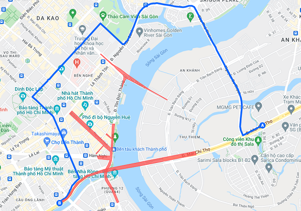 Lộ trình từ thành phố Thủ Đức đi Quận 1: đường Mai Chí Thọ → đường Nguyễn Cơ Thạch → cầu Thủ Thiêm 1 → đường Nguyễn Hữu Cảnh → đường Nguyễn Bỉnh Khiêm → đường Lê Duẩn → đường Nam Kỳ Khởi Nghĩa → đường Võ Văn Kiệt (Quận 1). (hình 7)