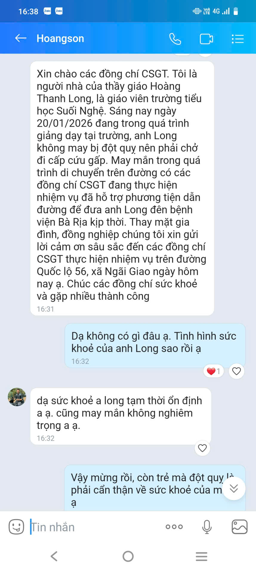 Sau khi qua cơn nguy kịch, gia đình và phía Nhà trường của thầy giáo Long đã bày tỏ sự xúc động và gửi lời cảm ơn sâu sắc đến các đồng chí Tổ công tác của Đội CSGT số 2 vì tinh thần trách nhiệm, sự tận tâm và nghĩa cử cao đẹp trong lúc nguy nan.