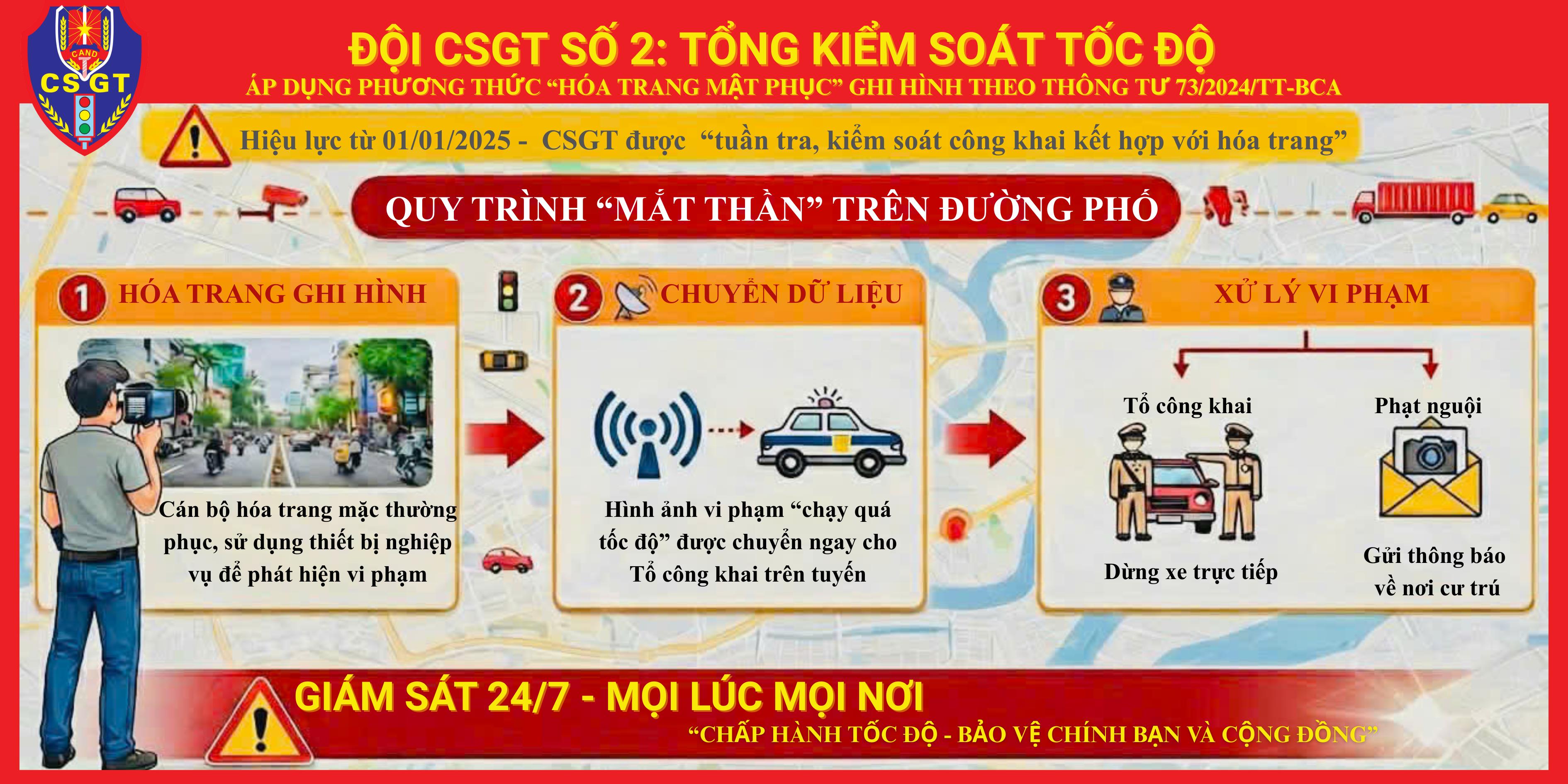 Theo Thông tư 73/2024/TT-BCA, lực lượng CSGT được thực hiện tuần tra, kiểm soát công khai hoặc kết hợp hóa trang theo kế hoạch đã được phê duyệt. Việc ghi nhận hành vi vi phạm tốc độ được thực hiện thông qua các thiết bị kỹ thuật nghiệp vụ đã được kiểm định, bảo đảm tính chính xác, khách quan và đúng quy định pháp luật.