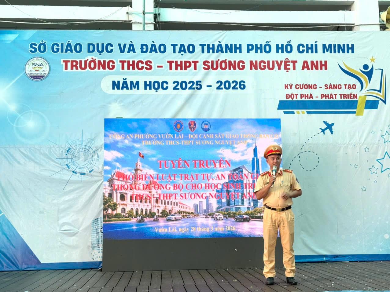 Theo đó, vào sáng ngày 28/3/2026, Ban giám hiệu Trường THCS – THPT Sương Nguyệt Anh, phường Vườn Lài đã phối hợp Đội CSGT Bàn Cờ tuyên truyền Luật Trật tự, an toàn giao thông đường bộ cho 700 học sinh và 40 giáo viên nhà trường.