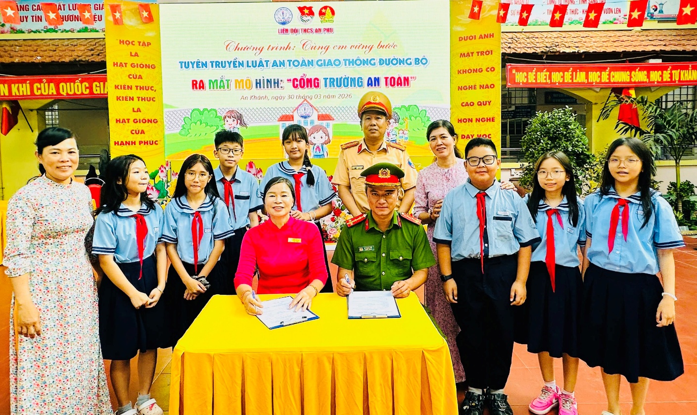 Điểm nhấn của chương trình là lễ Ký kết bản cam kết xây dựng “Cổng trường ATGT” giữa đại diện Đội CSGT Cát Lái, Công an phường An Khánh, Ban Giám hiệu nhà trường và đại diện phụ huynh học sinh. Các nội dung cam kết trọng tâm bao gồm: