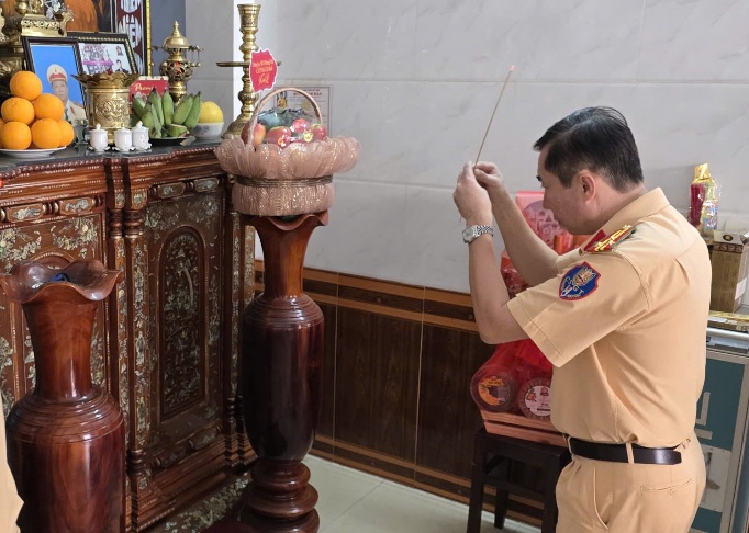 Hình ảnh: Đoàn Thường vụ Đảng ủy – Ban Chỉ huy Phòng do đồng chí Thượng tá Đỗ Xuân Hoàn –Phó trưởng phòng làm trưởng đoàn thăm hỏi, động viên CBCS Đội Cảnh sát giao thông Chợ Lớn và thăm hỏi thân nhân gia đình và thắp nhang cho các đồng chí nguyên lãnh đạo Phòng Cảnh sát giao thông đã từ trần