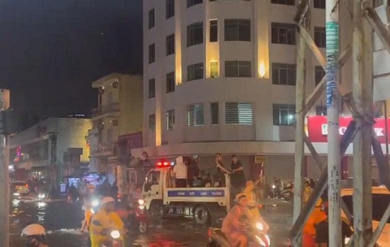 Đội Cảnh sát giao thông Chợ Lớn phối hợp hỗ trợ người dân vượt qua vùng ngập nước |