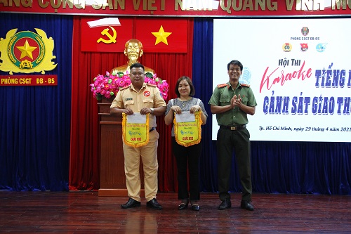 Đ/c Thượng úy Nguyễn Thanh An Bình – Phó Bí thư Đoàn Thanh niên CATP trao thưởng cho các tiết mục đạt giải nhì.