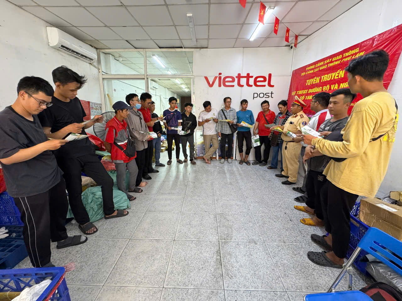 Thực hiện Kế hoạch tuyên truyền, phổ biến giáo pháp luật và vận động quần chúng nhân dân bảo đảm trật tự an toàn giao thông của Phòng CSGT, vào lúc 13h00 ngày 28/3/2026, Đội CSGT Phú Lâm - Phòng CSGT Công an TP. Hồ Chí Minh tổ chức tuyên truyền phổ biến pháp luật về Trật tự, an toàn giao thông đường bộ và phát tài liệu tuyên truyền cho 22 nhân viên, người lái xe của Công ty dịch vụ chuyển phát nhanh Viettel Post - số 625 Kinh Dương Vương, Phường An Lạc, TP. Hồ Chí Minh, tham dự với chủ đề "Luật trật tự, an toàn giao thông đường bộ và Nghị định số 168/2024/NĐ-CP", nhắc nhở "Đã uống rượu, bia - không lái xe", hướng dẫn các quy tắc, kỹ năng tham gia giao thông an toàn, quy định về điều kiện tham gia giao thông của người điều khiển phương tiện, không chở hàng cồng kềnh, nhận diện điểm mù của các xe ô tô, kỹ năng phòng tránh tai nạn giao thông.