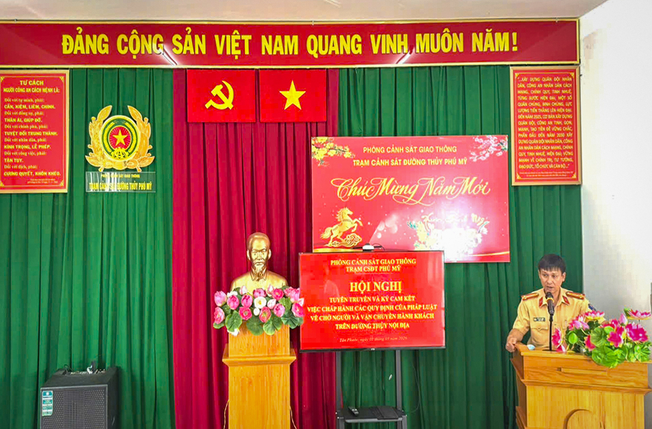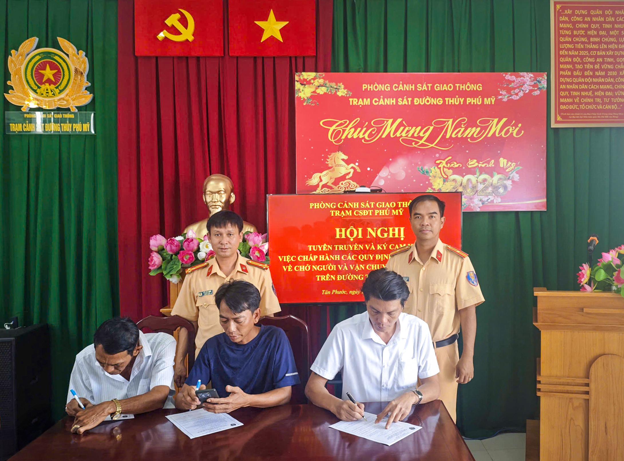 Ngày 01/3/2026 tại hội trường “Trạm CSĐT Phú Mỹ tổ chức tuyên truyền và ký cam kết chấp hành pháp luật về vận chuyển hành khách trên đường thủy nội địa đối với các chủ phương tiện, người điều khiển phương tiện vận chuyển hành khách trên địa bàn.