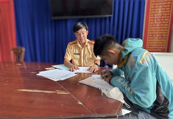 Bằng các biện pháp nghiệp vụ, Trạm CSGT Tân Túc đã xác định được người điều khiển xe mô tô có hành vi vi phạm trên. Tại Trạm CSGT Tân Túc, người điều khiển xe mô tô biển kiểm soát 59TA-151.xx tên P.M.T (hiện ngụ tại Tiền Giang) đã thừa nhận: khoảng 13 giờ 30 phút ngày 20/11/2024, tại Quốc lộ 1 đã có hành vi điều khiển xe mô tô biển kiểm soát 59TA-151.xx dùng chân đẩy một xe khác do muốn hỗ trợ đẩy xe vào lề. Ông P.M.T đã thừa nhận hành vi vi phạm của mình và nhận ra hành vi vi phạm của mình là vi phạm Luật Giao thông và chấp hành các biện pháp xử phạt đúng theo quy định Pháp luật